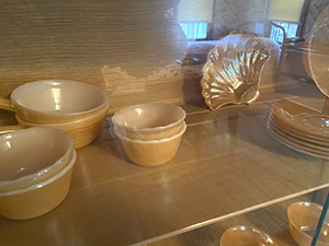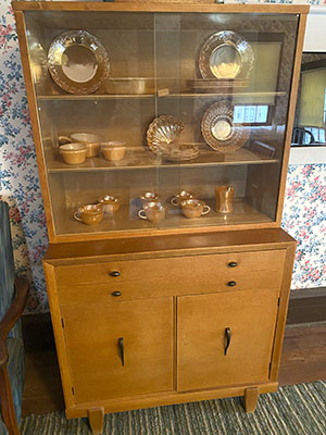 The china cabinet at left holds the museum's collection of Fire King glassware with the "Peach Lustre" mirror finish. Below are individual pieces including small bowls, bowls with handles, saucers, plates, and the clam shell candy dish. The low cost borosilicate glassware was oven proof. The colors and patterns were especially bright.