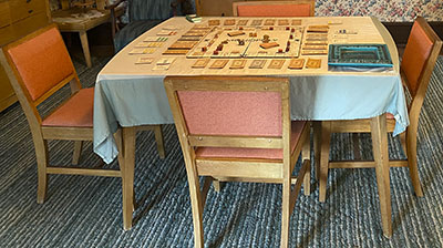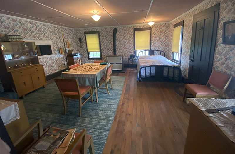 In the center of the room is a dining table that is set up with a vintage game of Monopoly, popular with adults and children during the Fifties and Sixties. The Parker Brothers version of the game that we know was developed in the 1930s during the Great Depression. This original game has wooden playing pieces. Board games and the radio were the favorite forms of home entertainment. Television reception in the Waynesville valley was weak to nonexistent during most of the decade.