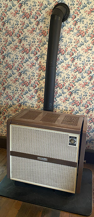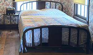 The metal bed is covered with a chenille (French for "caterpillar") bedspread, a cover with thick pile, plus a quilt. The King Heater at right was the fuel oil descendant of the wood burning sheet metal King Heater in the 1941 room. |