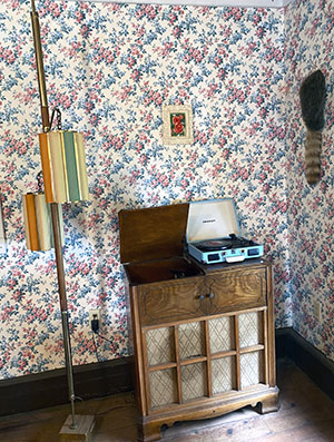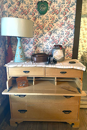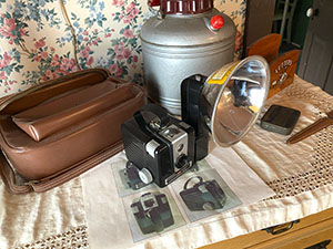In the northwest corner of the room is a small desk with a dropdown writing shelf. On top of the desk is a Kodak Brownie Hawk-eye box camera with flashbulb attachment. The original Hawkeye was introduced in May of 1949 for $7.00. In September of 1950, the flash model appeared for an additional $4.00. Increasingly, young visitors to the museum are unfamiliar with roll film cameras, thinking cameras have always been digital or photographs are just taken with you phone. |