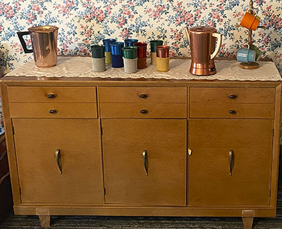 The blond buffet provided storage and a serving surface. On top is a set of aluminum tumblers in a variety of colors which were very popular during the period. However, cold drinks made them sweat. Knitted booties made them easier to hold. The best coffee is made with the aluminum percolator on the right. |