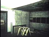 The ceiling was covered with painted beaverboard which had been stained and cracked by a leaking roof. A college student on Spring Break lends a hand with some neck breaking work.