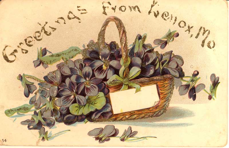 This is an early German card, as is Lenox(1), with glittered lettering and flower centers. It is is dated October 24, 1908. The message read "Dear Cousin. Will ans. your letter soon. Fear we can't come y;et awhile but will come as soon as can possible do so. Yours with Love M. R. C.." In 1908, a trip from Lenox to Waynesville would have been an overnight one. No one had one of Ford's new Model T's yet.