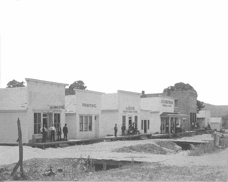 On September 27, 1887, a disastrous fire swept through the business houses of Waynesville,which were located on the south side of the square on Commercial Street (now Historic Route 66.) All of the buildings were destroyed but, according to George Reed, most werebuilt by the end of the year. The devastating loss to the businessmen amounted to $30,000. The fire originated in a building belonging to J. R. Burchard, used as a post office and drug store. Perhaps feeling guilty and not wanting to be resposible for an incendiary repeat, J. R. Burchard built the first brick business house on the new commerical row. That structure stands out on the right side of the picture above. This helps to date the picture to, at the earliest, the summer of 1888.
