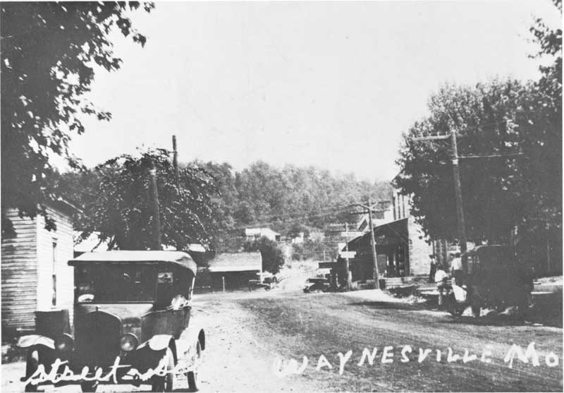 This is a rare view on Commercial Street (now Historic Route 66) from west to east. It must be after 1906 because of the cars in the picture, plus the concrete block building mid-right was completed at the close of that year. On enlarging the picture but not visible in this representation, the block building, belonging to J. M. Long, has a sign proclaiming "Waynesville Post Office." The second story of Long's store was the "opera house", a space for entertainments for the community. Commerical Street would have been designated State Highway 14 and is possible surfaced with macadam, although gravel is more likely. Barely visible at the end of the street as it curves up Waynesville hill is a fence on the left side of the roadway. There cetainly must have been one on the right side, too, as that was a steep hillside.