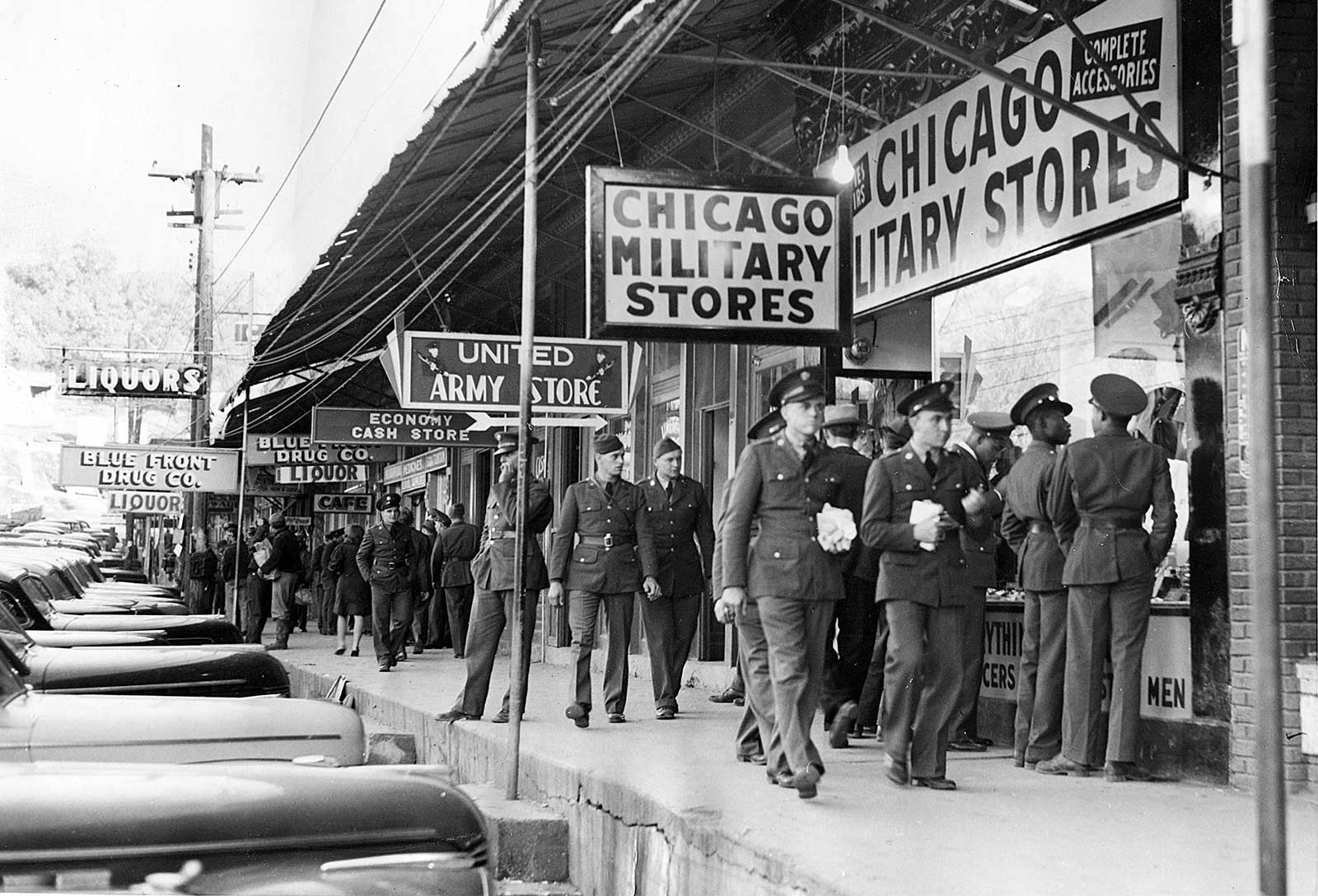 This picture is from a series of photographs shot in 1941 by Wide World Photos. The originals were purchased by Jan and Terry Primas. The series is titled "Soldiers--All Dressed Up With No Place To Go!" The photo above was labeled for release on Sunday, December 7, 1941, the day Pearl Harbor was bombed, leading to the United States' entry into World War II. The caption for the image reads, "Fort Leonard Wood, MO. - Uniformed window shoppers fill the sidewalks of Waynesville, Mo., every Saturday afternoon. There is little else to do in the daylight hours besides 'walking post on Main Street' in this small town, situated eight miles from camp." This was the business row on the south side of the square in Waynesville, looking east. |